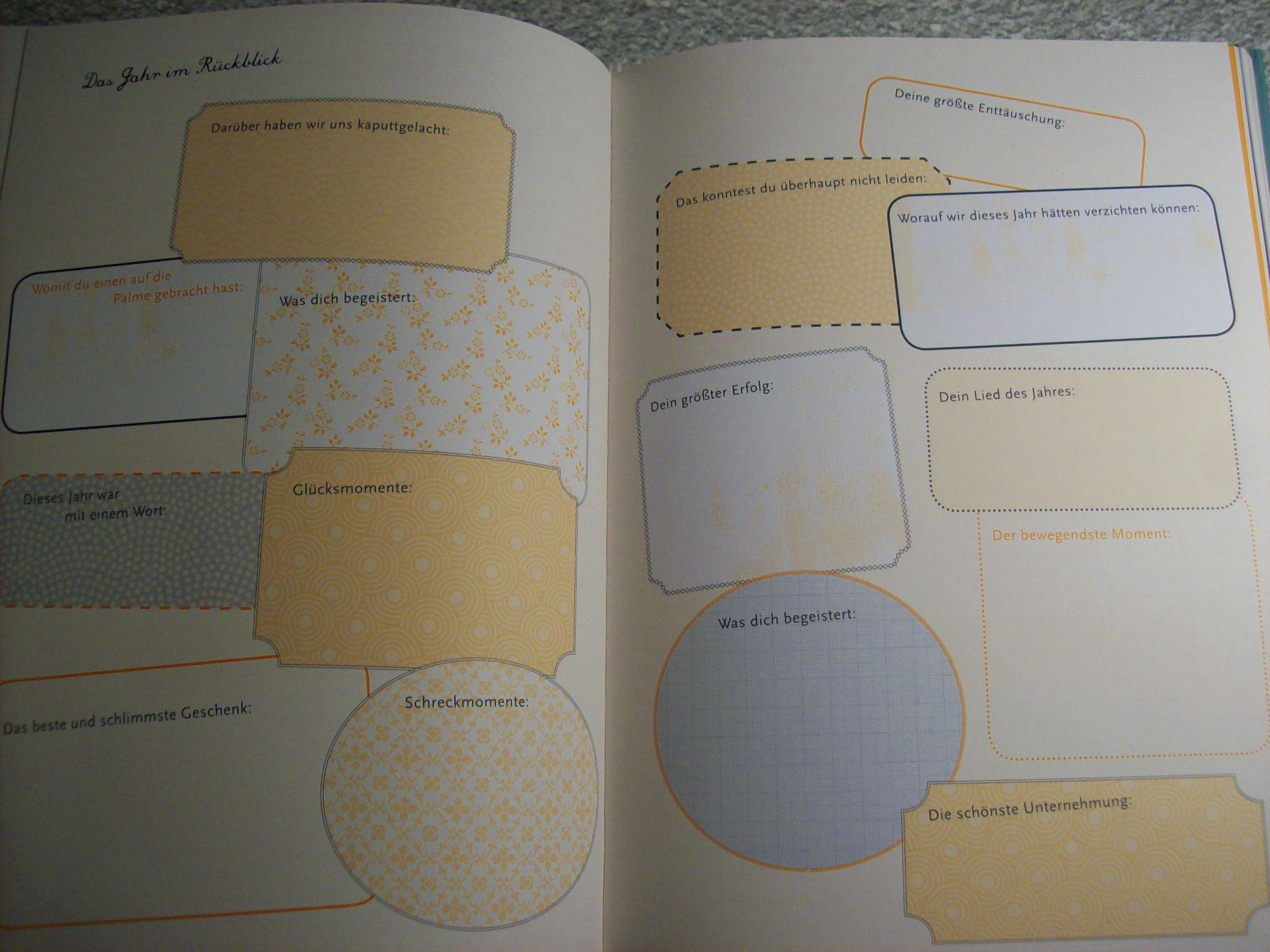Das Schöne daran: Man braucht keine Romane schreiben. Oft reichen einzelne Sätze oder Worte als Antworten. Auf der letzten Seite jedes Lebensjahres klebt dann ein Umschlag mit einem leeren Blatt und der Aufforderung: „Was ich dir sagen will“. Wie schön ist das denn? Das gesamte Erinnerungsalbum ist äußerst liebevoll und hübsch illustriert. Je mehr man reinklebt, desto dicker wird es, von daher ist die weiße Schnur zum Umwickeln und Zusammenhalten tatsächlich praktisch.