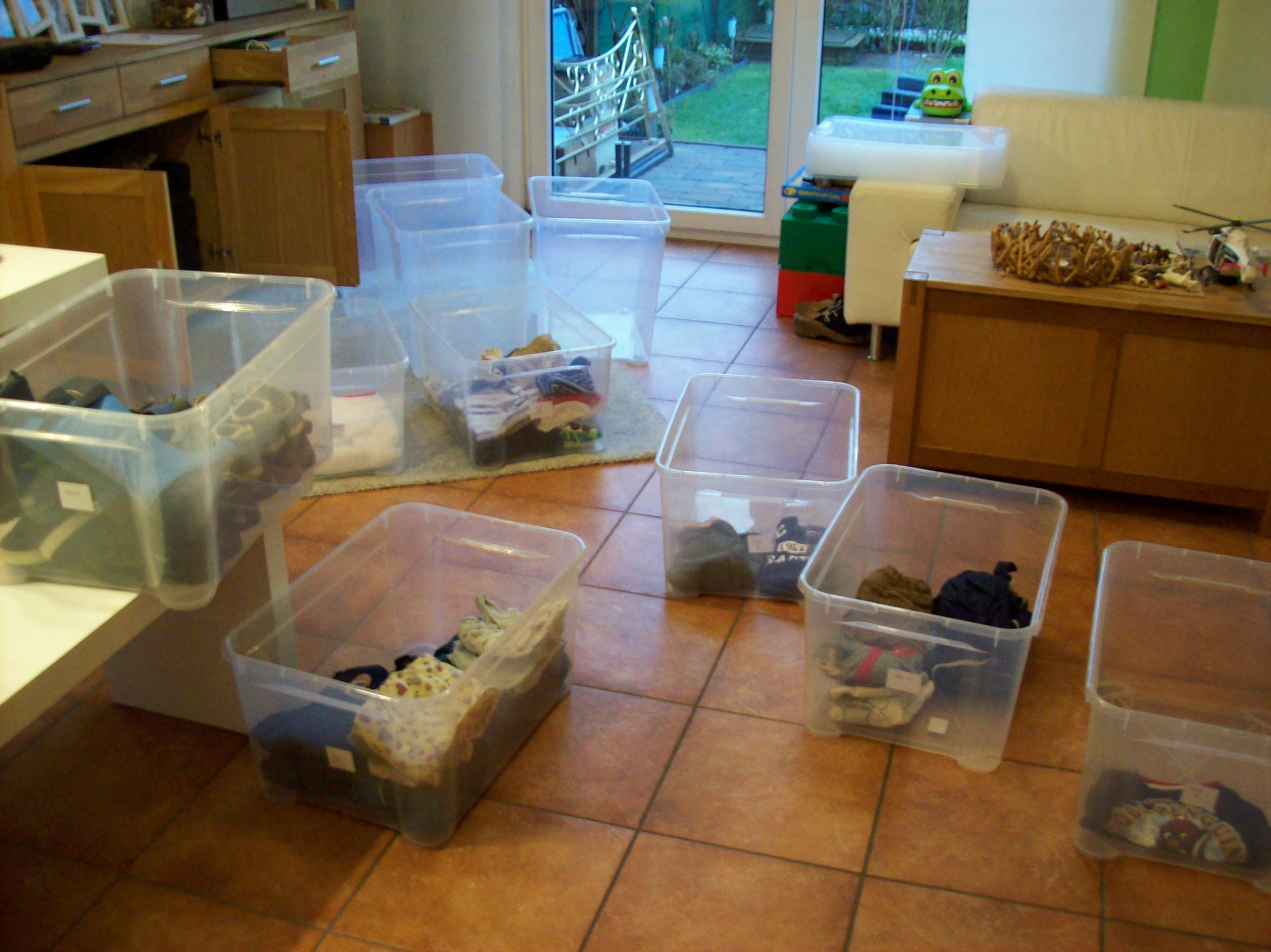 Die fleckigen Sachen habe ich weggeschmissen, alles andere in die Boxen gepackt. Und die sind jetzt tatsächlich so groß, dass eine Größe bequem rein passt. Sie haben einen festen Deckel, lassen sich also optimal verschließen.Allerdings: Ganz billig sind die Boxen nicht. Sie gibt es auch bei Ikea. Aber das ist ja eine Anschaffungs fürs Leben, wenn die Kinderkleidung irgendwann rausfliegt, kommt eben was anderes rein.