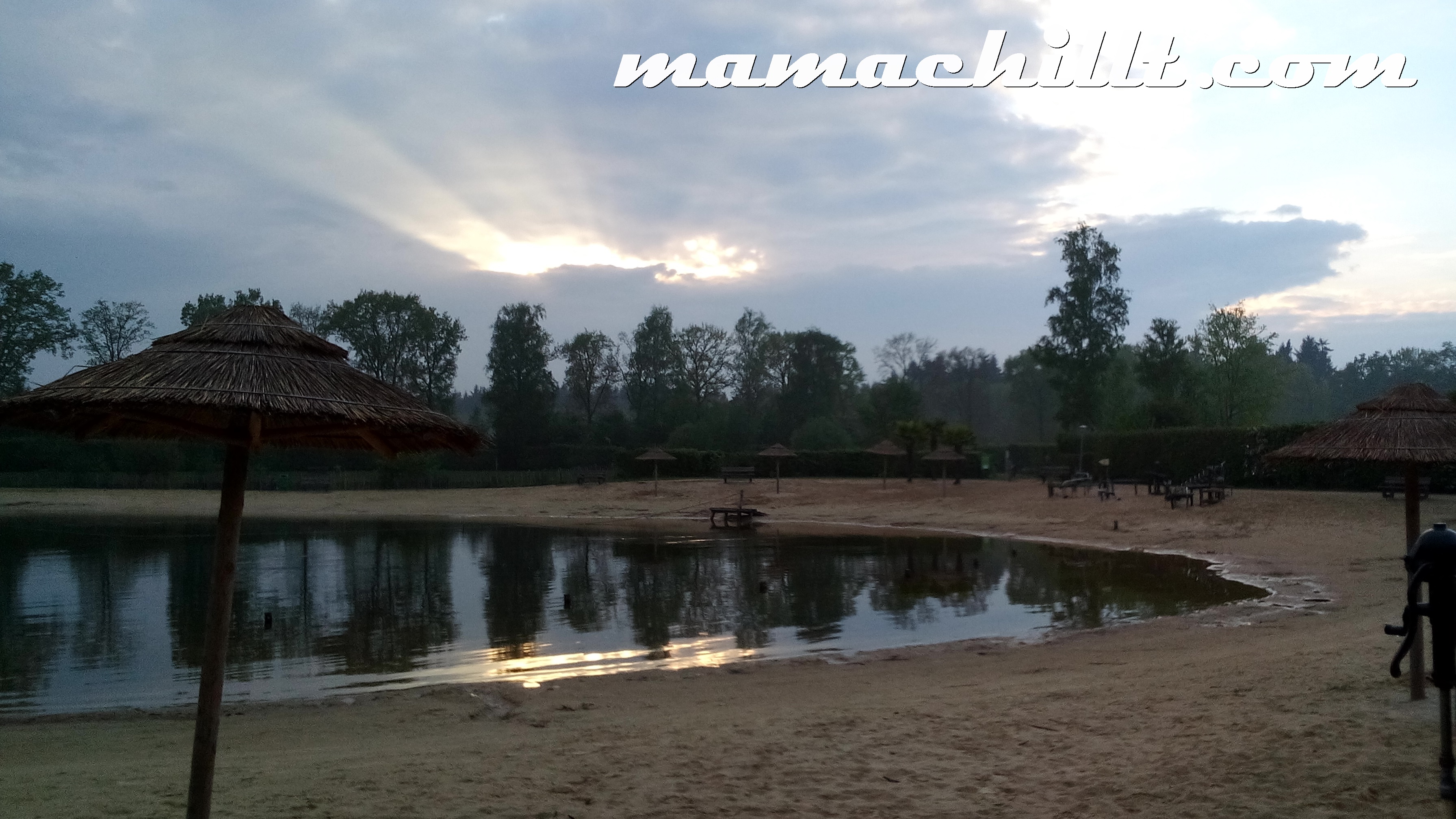 Dann ging es zurück auf den Campingplatz nach Ommen. Da es noch nicht dunkel war, sind mein Sohn und ich noch einmal zu dem Ort gegangen, der uns auf dem ganzen Platz am besten gefallen hat: Der aufgeschüttete Strand, der „Playa kleine Wolf“. Ein riesiges rundes Sandareal, mit Wasserspielplätzen, Pumpen und einem Floß in der Mitte des Sees. Ein gigantischer, traumhafter Sandkasten umringt von Sonnenschirmen aus Stroh. Hier hat der Kleine fast eine Stunde seelenruhig gespielt – mit dem Sandspielzeug vor Ort, denn mitgenommen hatten wir keines.
