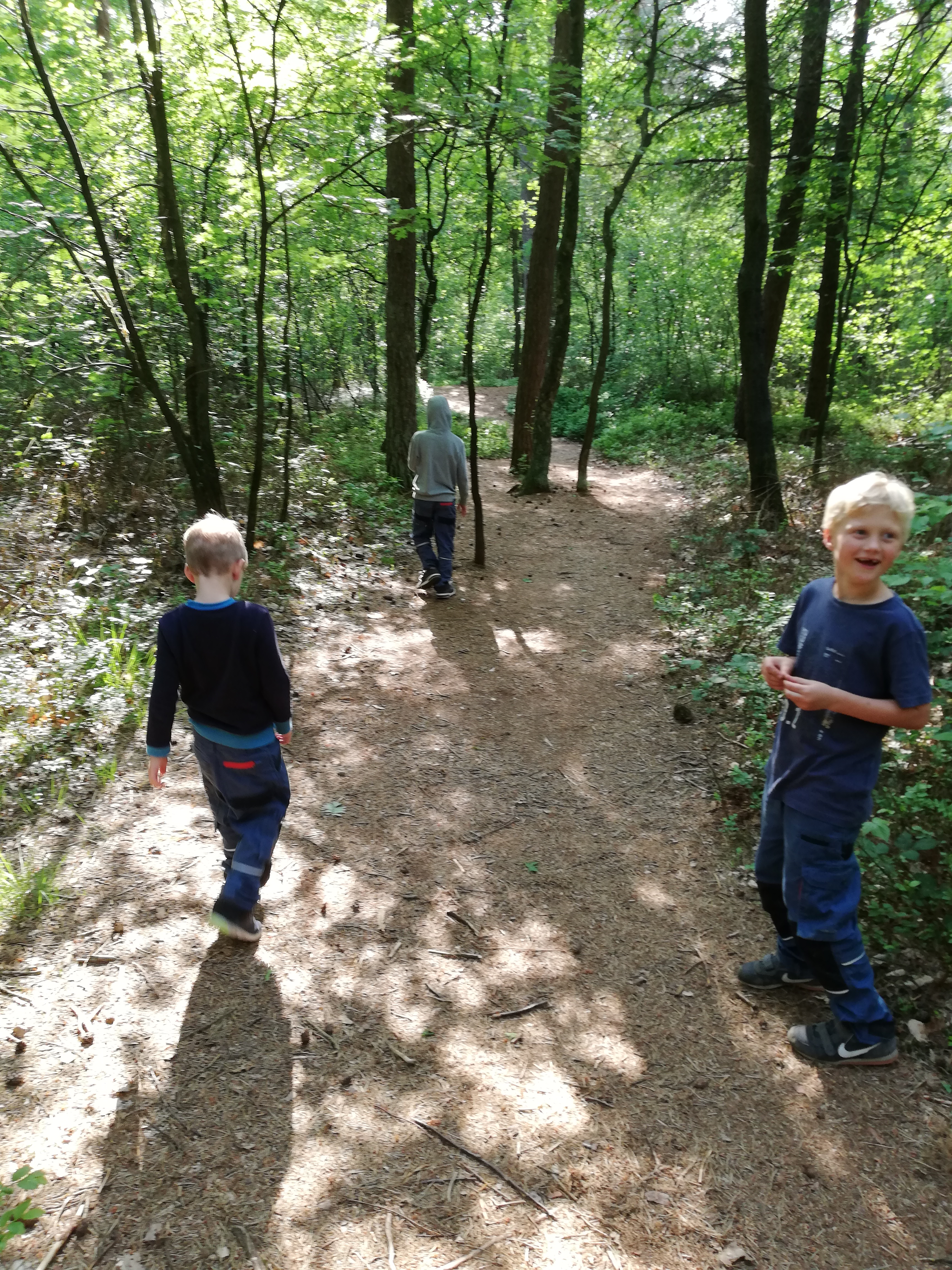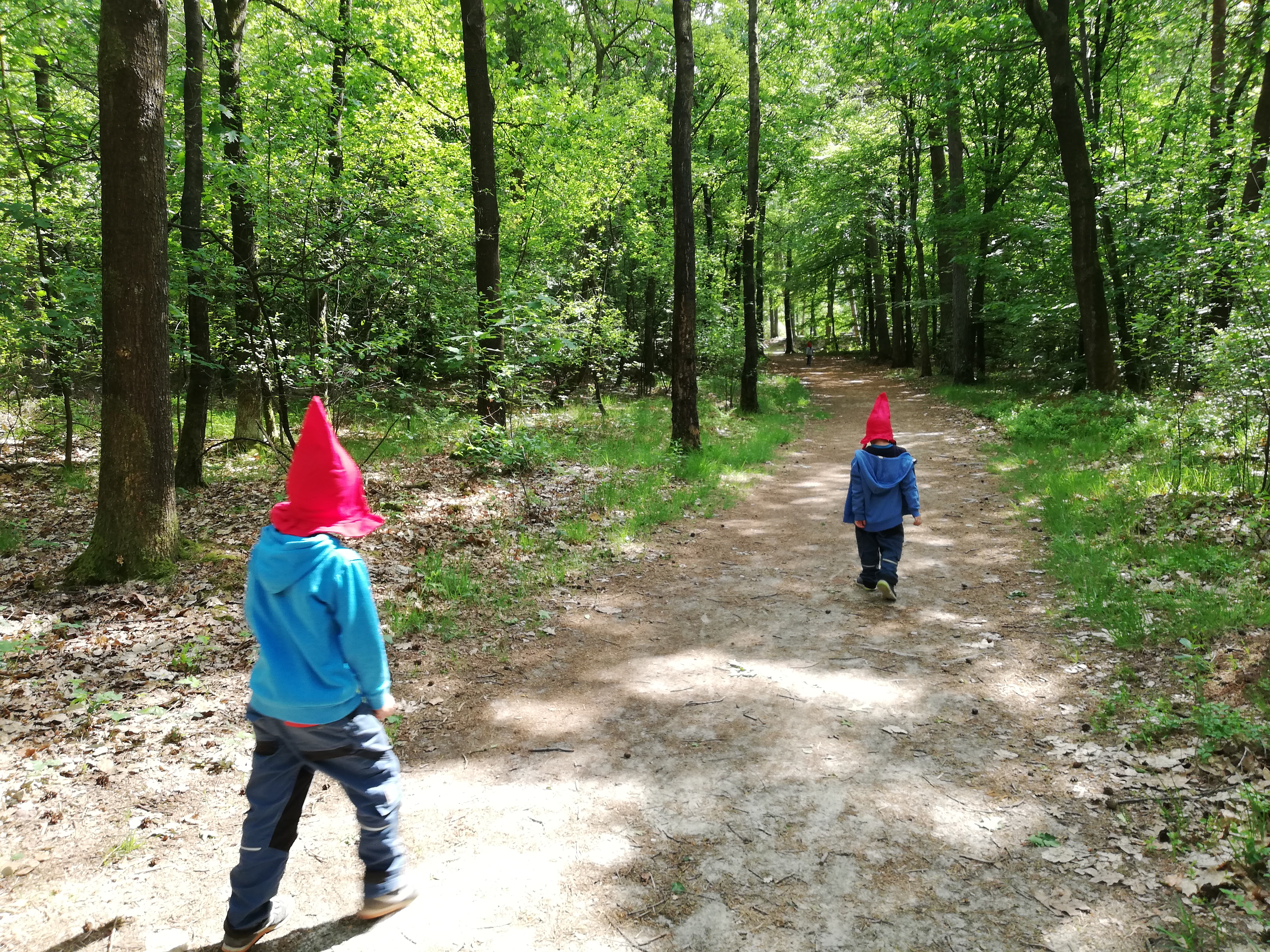 Wir sind satt und müssen uns bewegen. Also wandern wir (die Kinder mit passender Zwergenmütze von De Heikamp) durch den Wald von Ruurlo auf der Wouter-Winzig-Route. Das ist die Zwergenwanderung, eine Wanderstrecke die extra für Kinder mit kleinen Holzzwergen ausgezeichnet wurde. Diese Route dauert etwa eine gute Stunde ist auch schon für kleine Kinder optimal geeignet. „Da ist wieder einer!“: Die Jungs hatten viel Spaß, den Zwergen zu folgen.