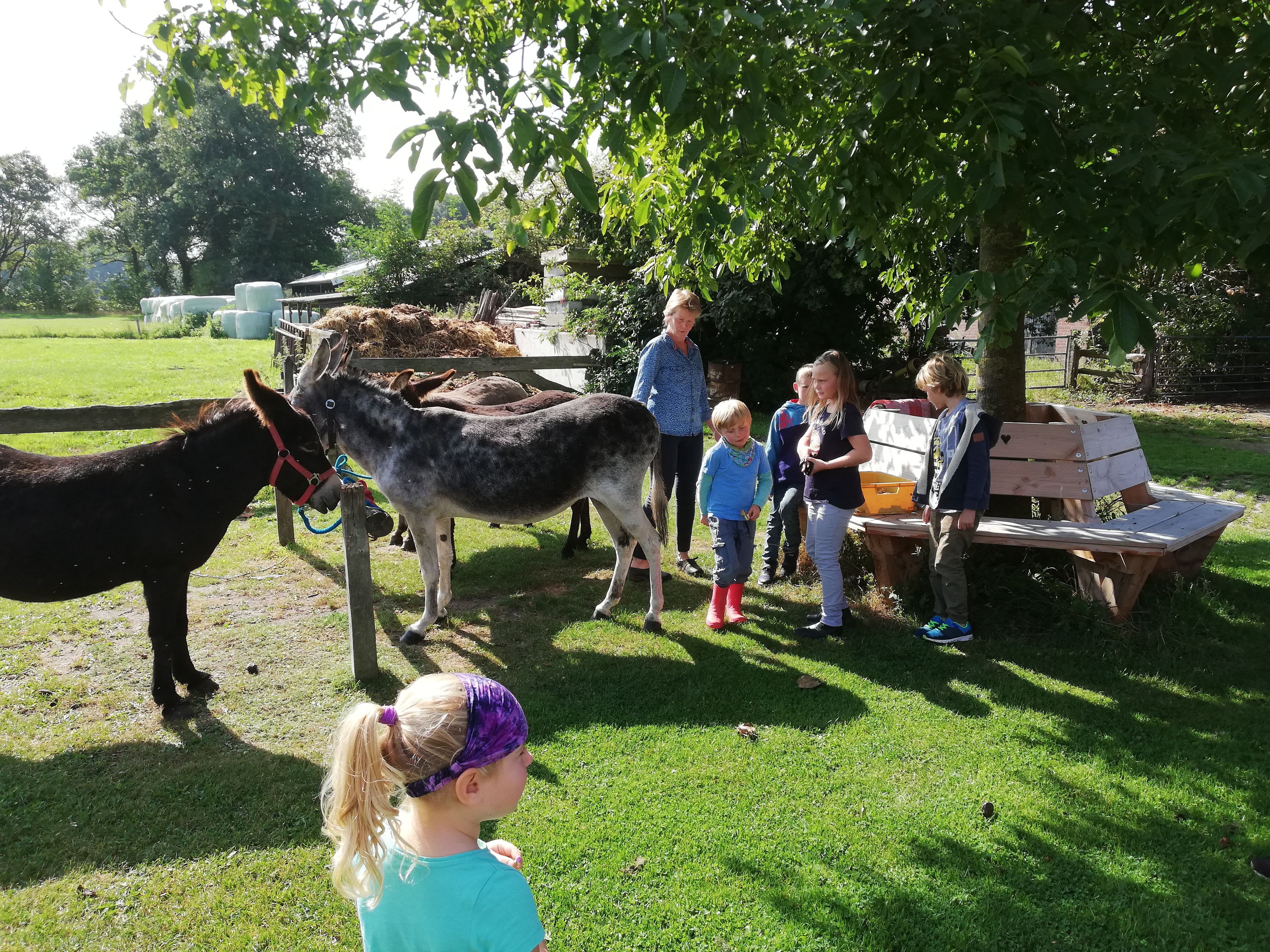 Vielleicht wird es aber auch daran gelegen haben, dass wir als Gruppe irgendwann von unserem eingeplanten Weg abgekommen sind. Plötzlich standen wir auf einer großen Weide mitten im Nirgendwo – und dann fing es auch noch an zu schütten. Die Esel drängten an den Weiderand, um unter den umstehenden Bäumen Schutz zu suchen, und wir und die Kinder harrten aus im holländischen Regenguss. Der dauerte aber zum Glück nur kurz und wir entschlossen gemeinsam den Heimweg anzutreten – und das Picknick auf unseren Startpunkt am Bauernhof zu verlegen. Da es hier einen Spielplatz gibt, fanden die Kinder unsere spontane Planänderung super.