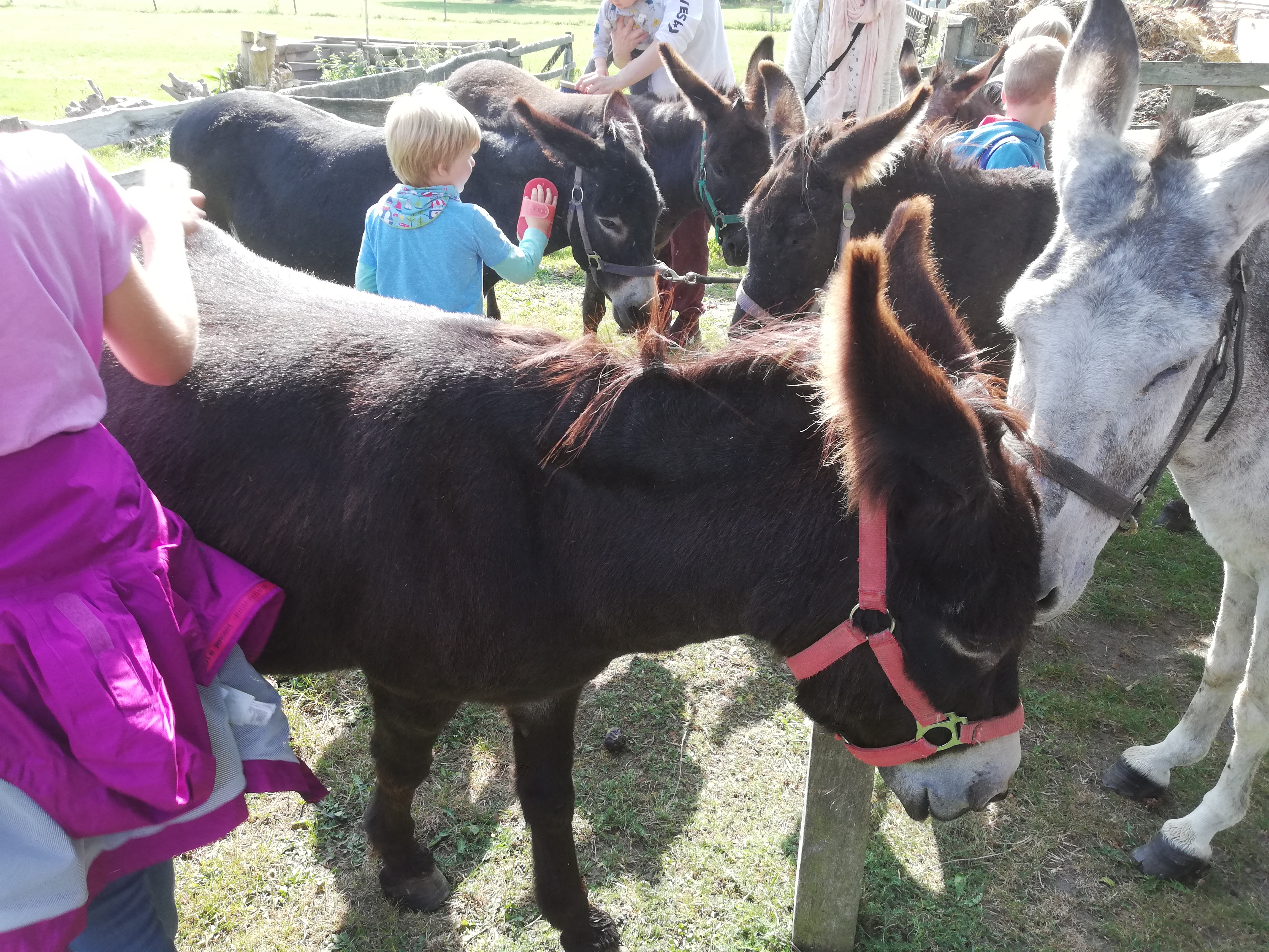 Die Kinder hatten großen Spaß mit den Eseln, schon direkt am Anfang beim Striegeln und Saubermachen, und später beim Reiten sowieso. Die meisten Esel ließen sich von uns Eltern auch bereitwillig führen – nur Esel Joshi war auf der Tour etwas schwieriger in den Griff zu bekommen. Die Schafherden, die unseren Weg kreuzten, waren ihm nicht wirklich geheuer.